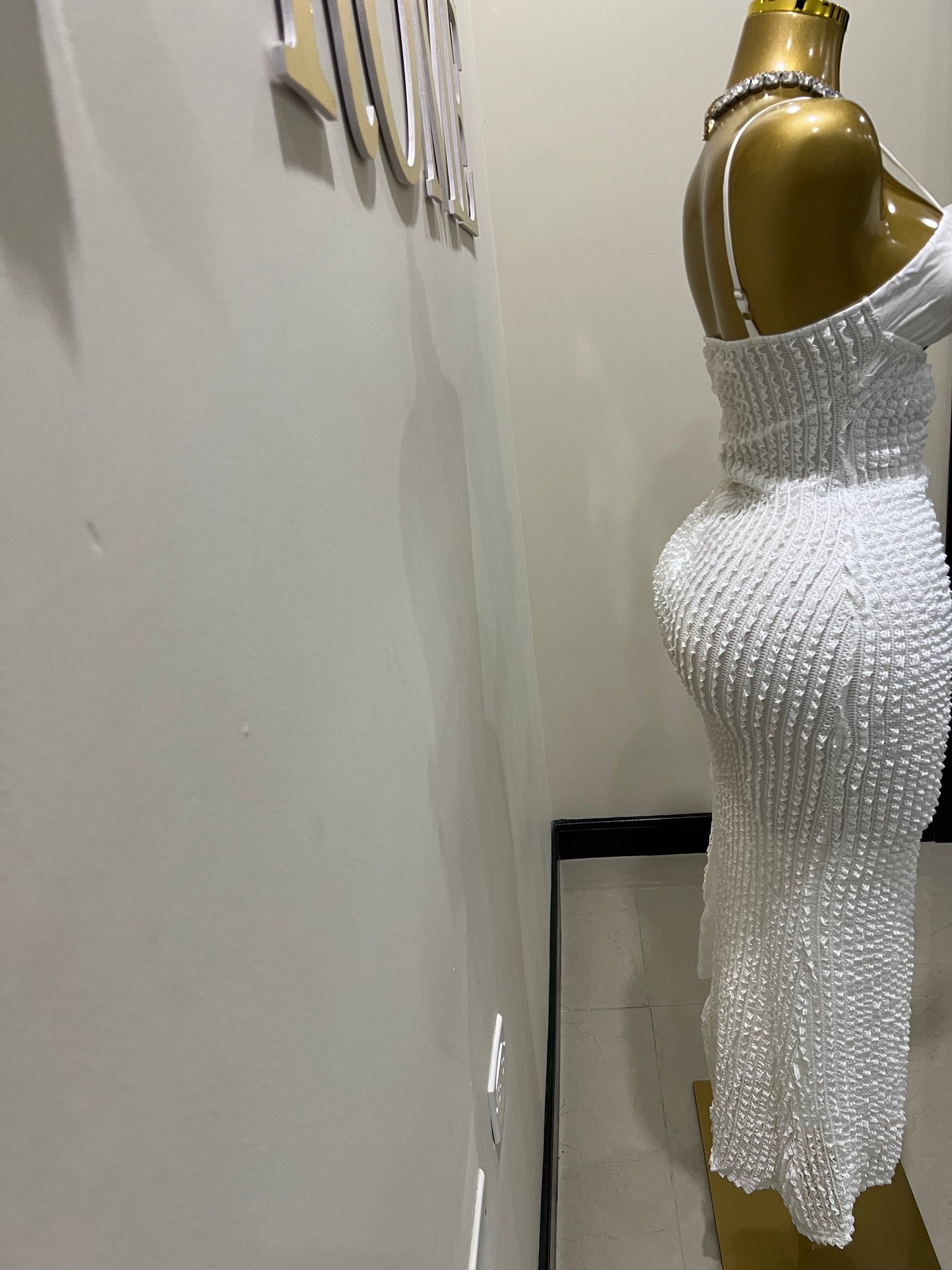 - The gold bbl mannequin is wearing size medium.