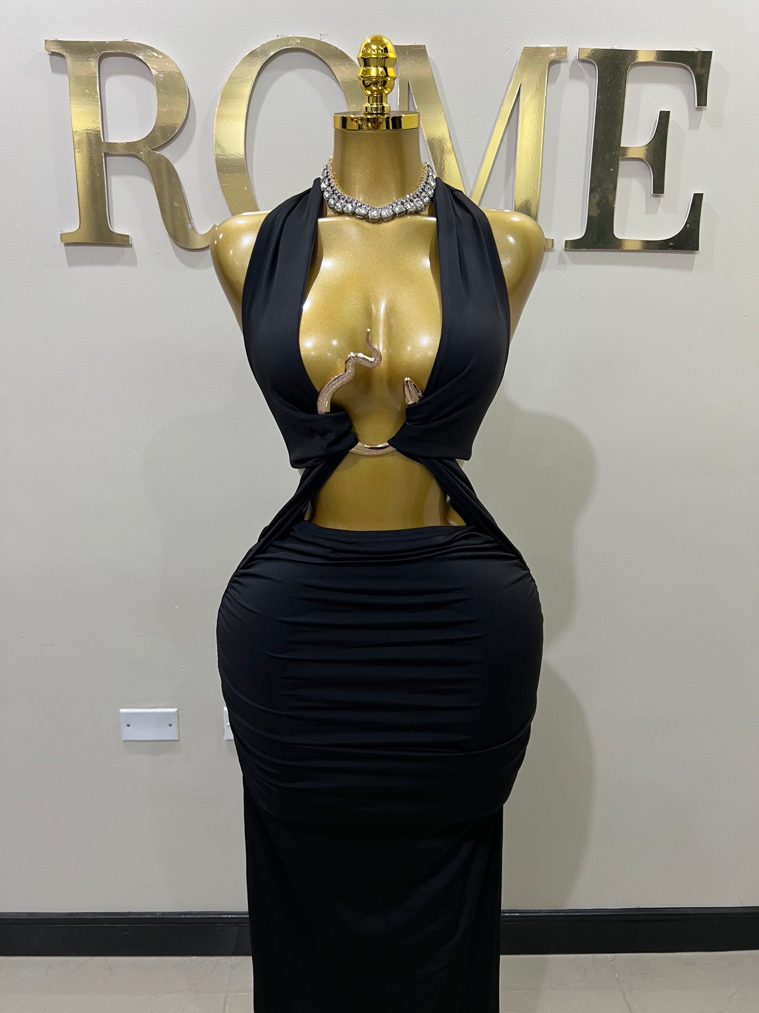 Snake Ming Deep V Dress (Black)